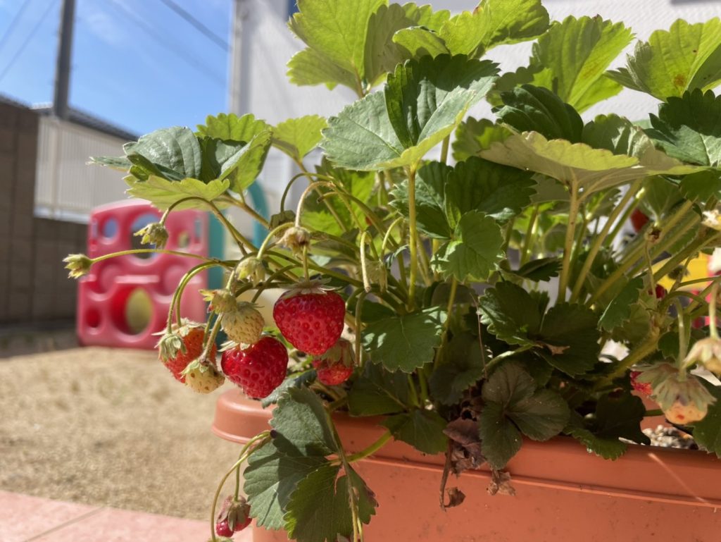 ニュース 2024/05/27 イチゴ収穫!! 昨年度に植えたイチゴの苗から可愛い花が咲いて、イチゴの実がなりました。 じーっとイチゴを観察中… 「青いのもあるね すっぱいよ」と呟く子どももいました。よく知っていますね。 真っ赤なイチゴみーつけた! 子ども達に収穫してもらいました♪ 収穫したイチゴを食べてみよう!いただきます♪ いい香り? ぱく! おいし~! 収穫ありがとう♪ 来年も美味しいイチゴ食べられますように☆
