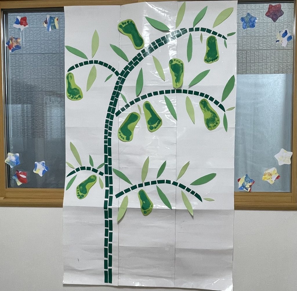 ニュース 2024/07/31 七夕会 七夕会を行いました。お母さんと一緒に、短冊を書いたり、わらべ歌やサーキットをしたりして七夕の雰囲気を味わいました。 短冊、笹飾りづくり♪何をお願いしようかな? 本物の笹に飾ったよ お部屋にある星を探して天の川を作るぞー! たくさんの星を探してくれたので、きれいな天の川になりました☆ 最後は、天の川くぐり☆キラキラ~☆ 七夕会楽しかったね。 みんなのお願い事が叶いますように☆